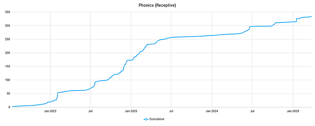 The cumulative number of mastered reading targets (phonics, digraphs, CVC/CVCC words):
